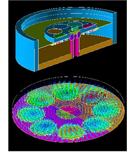 In one project we developed a detailed model of an MOCVD reactor, including induction heating, heat transfer through semi-transparent media, and gas flow and gas-phase chemistry for a rotating puck reactor. The analysis was focused on identifying the effect of geometric and processing parameters on the thickness and uniformity of the deposited films. This work resulted in re-design of certain reactor components.